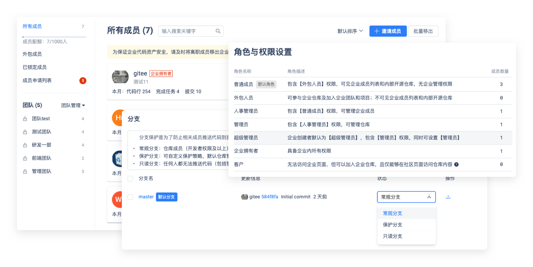 在 Gitee 专业版精细的权限管理加持下,安盟信息研发团队实现了统一的权限管理体系,从代码仓库到知识库,任何一项敏感操作都可以实现角色及其权限的自定义。