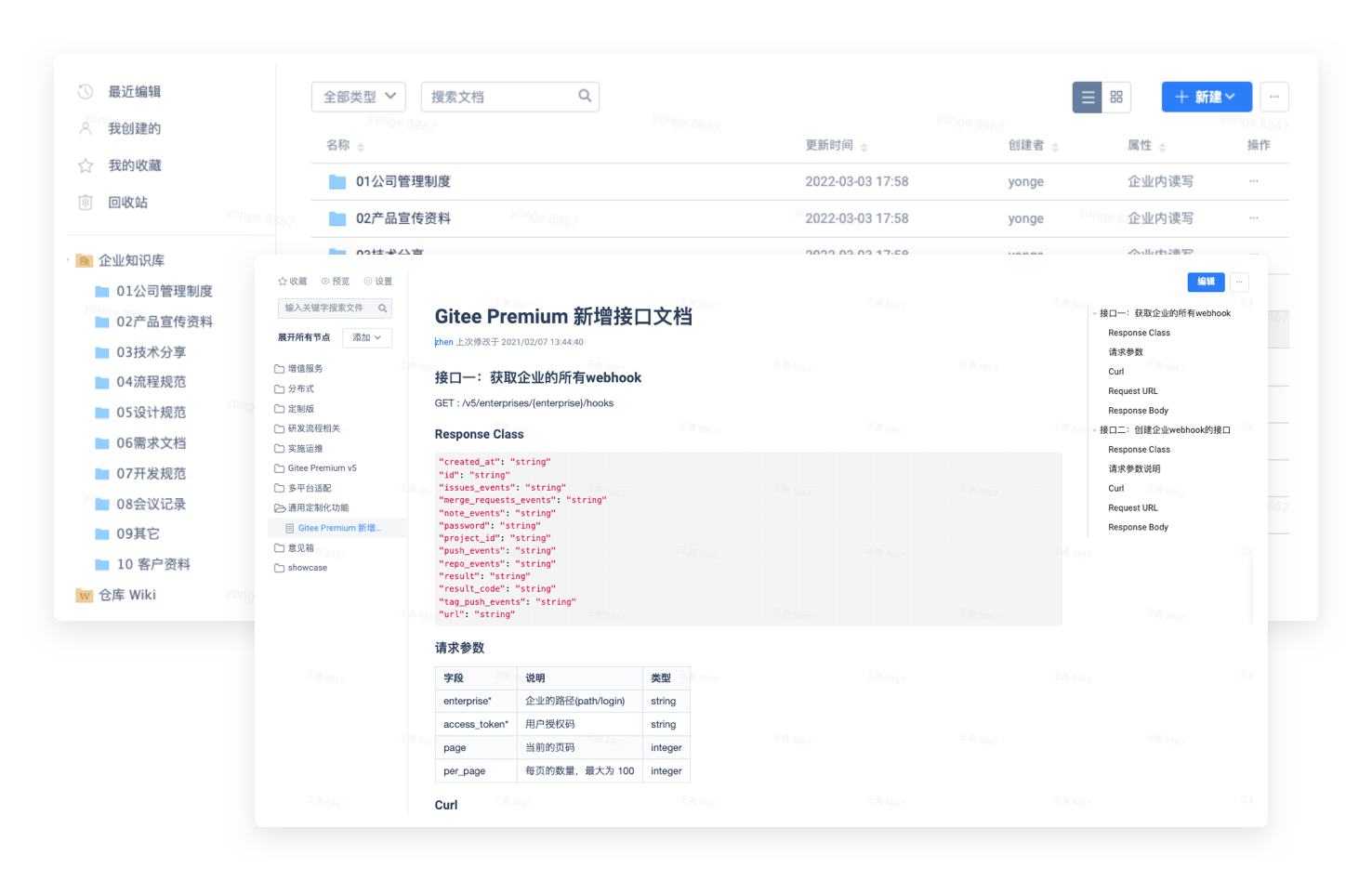 知识库在 Gitee Premium 的全流程协作中同样有着至关重要的作用,企业知识的沉淀与核心资产的质量安全同样重要。Gitee Premium 的知识库与代码仓库相同,基于 Git 进行版本管理并有完善的权限控制并支持多人协作,让研发团队也拥有属于自己的在线协作文档平台,实现企业知识的沉淀。