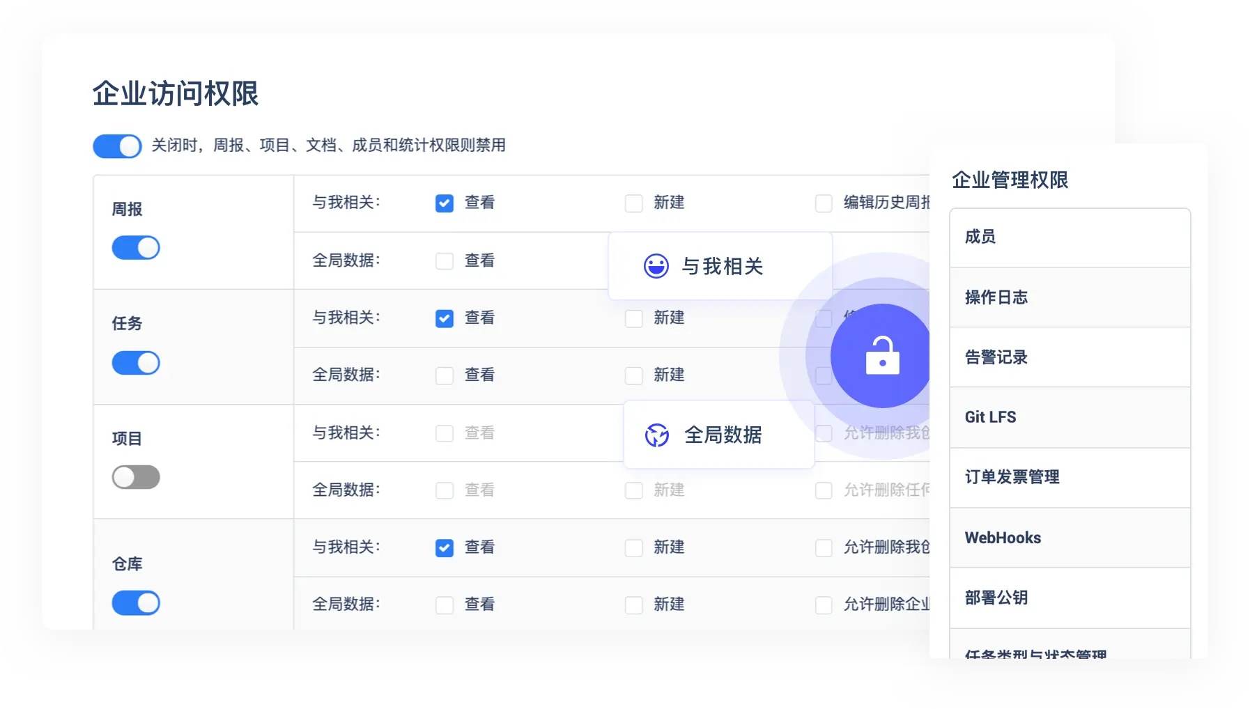 Gitee 专业版中支持进行「企业-项目-仓库-分支」四级管理,每一级别的操作均可进行精细的人员权限设置,让分⼯更有序,同时集团公司可以为事业群(子公司)建立独立企业进行数据隔离,做到企业资源权限由上至下逐级精细分配,最高限度保证数据安全。