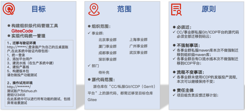 本次项目的两个主要目标分别是构建组织级代码管理工具 GiteeCode 和实现代码统一管理。Gitee 交付团队按照地域和代码管理工具划分了组织范围与源代码范围,并制定了四项迁移原则。