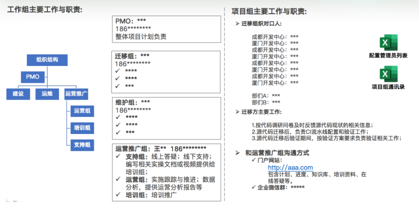 与此同时,该团队也在一周内成立整体项目内外部组织,明确目标方向以及分工,其中包括迁移组、运营组、支持组以及与企业 16 家单位的对接人。