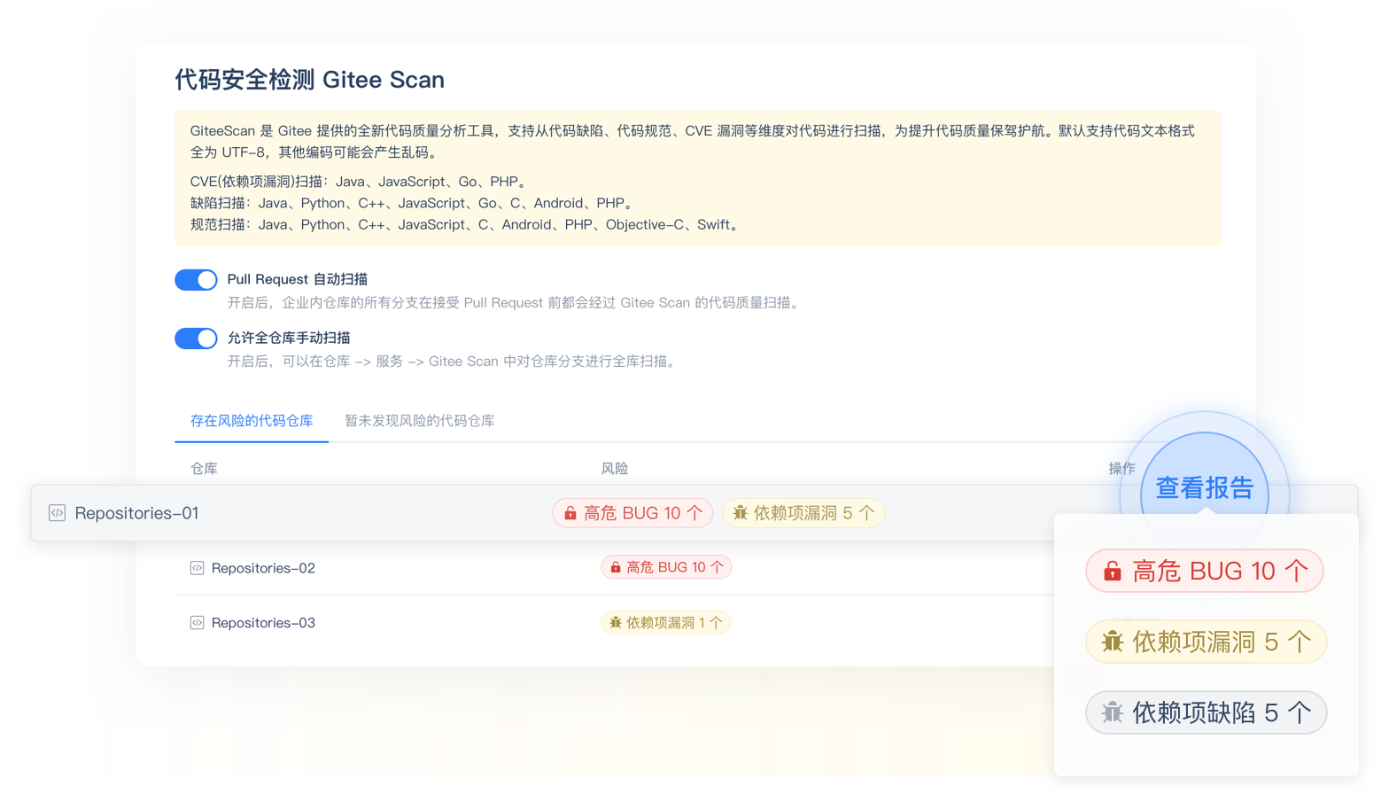 为了追求更高的代码质量,信息化团队采用了 Gitee 企业版的代码质量分析工具 Gitee Scan,能够帮助开发团队快速定位问题,提高团队代码评审的效率,进一步提高代码质量。