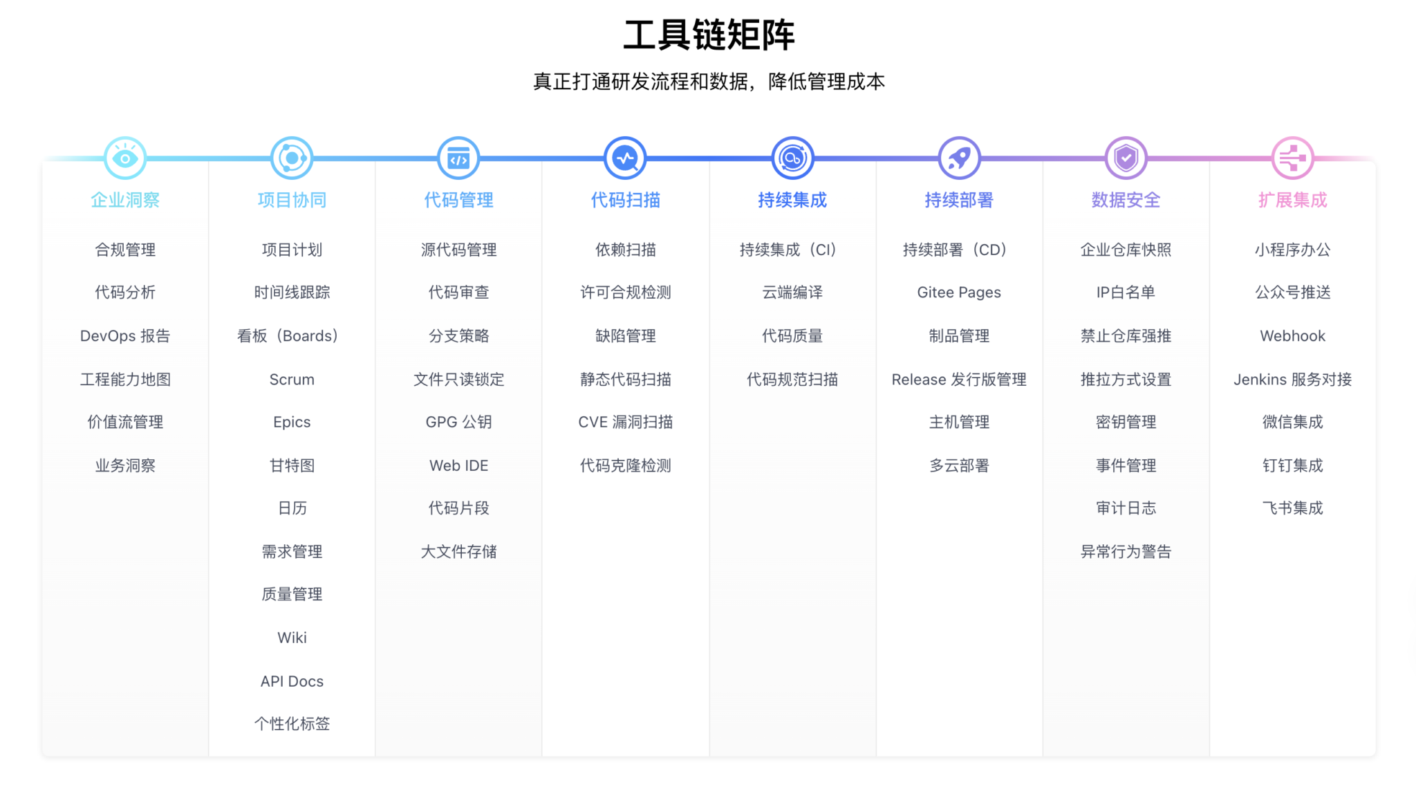 传统企业的信息化转型并非一蹴而就。 Gitee 作为全流程覆盖的 DevOps 研发管理平台,除代码管理外也拥有全面的工具链矩阵。中铁二十三局信息化团队就以代码管理为入口,以工作中最基础的管理出发,逐步向更高效的 DevOps 领域扩展,循序渐进地实现信息化转型。