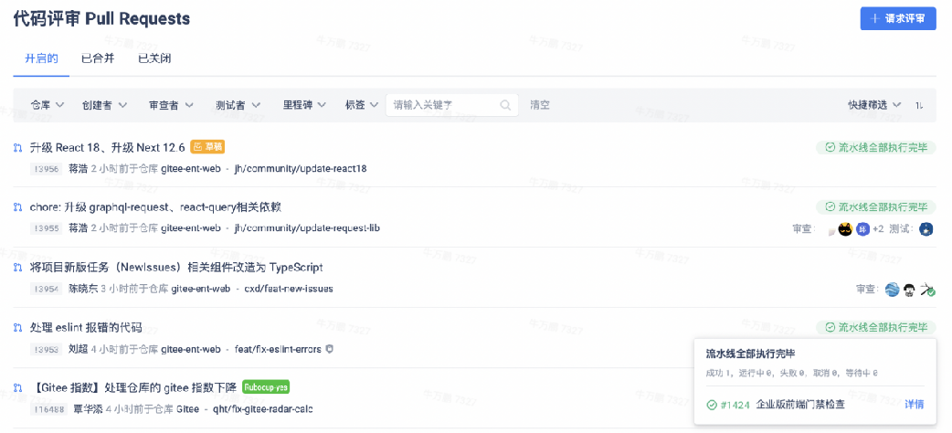 在提交代码审查过程中,企业内仓库的所有分支在合并 Pull Requeat 前都会经过 Gitee Scan 的自动代码质量扫描,同时还通过 CVE(依赖项漏洞)扫描、缺陷扫描、规范扫描,提高团队代码评审的效率,为企业代码质量保驾护航。